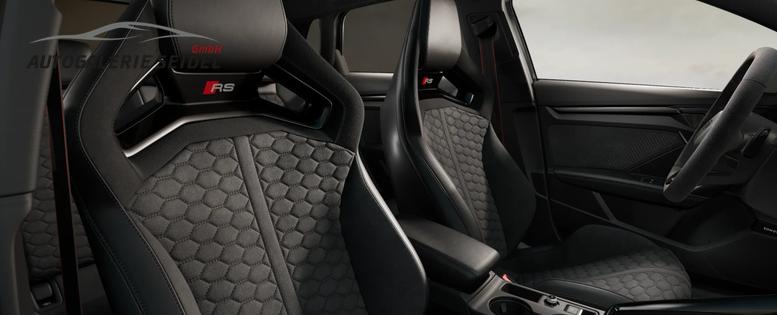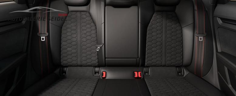• RS-Schalensitz in Microfaser Dina./Leder mit RS-Prägung und Wabensteppung (Sitzmittelbahn und Schulterbereich der Vordersitze in Mikrofaser Dinamica schwarz/tiefschwarz / Sitzseitenwangen, Kopfstützen und Mittelarmlehne in Leder Feinnappa schwarz mit Kontrastnähten in Rot / Wabensteppung / RS-Schriftzug in den Lehnen der Vordersitze)
