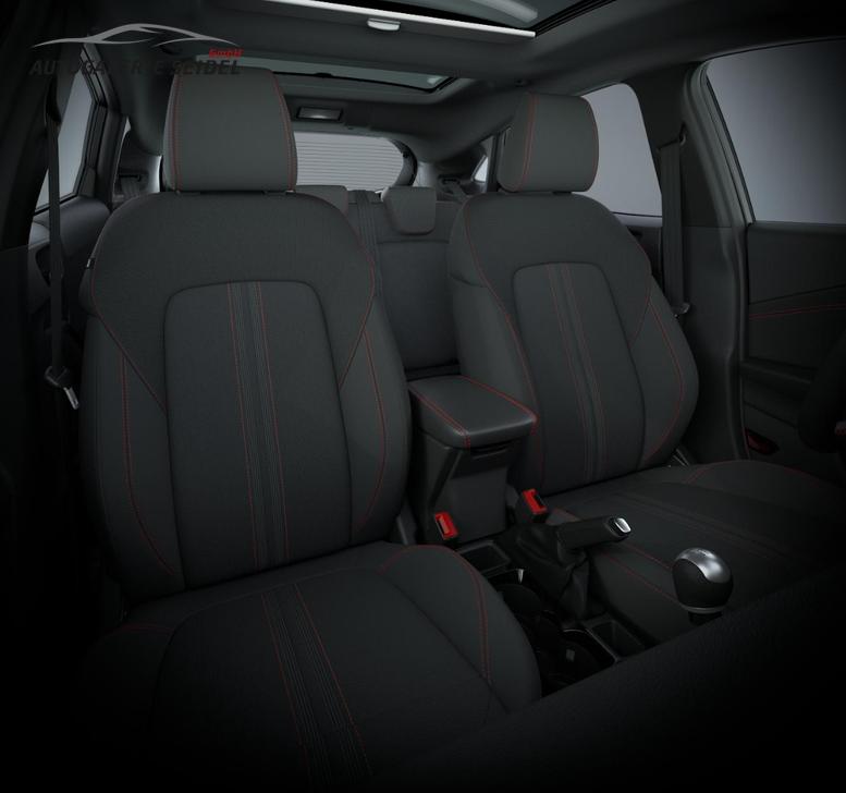 • Stoffpolsterung in Anthrazit mit Ziernähten in Rot