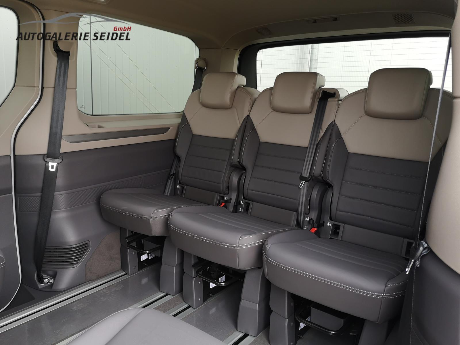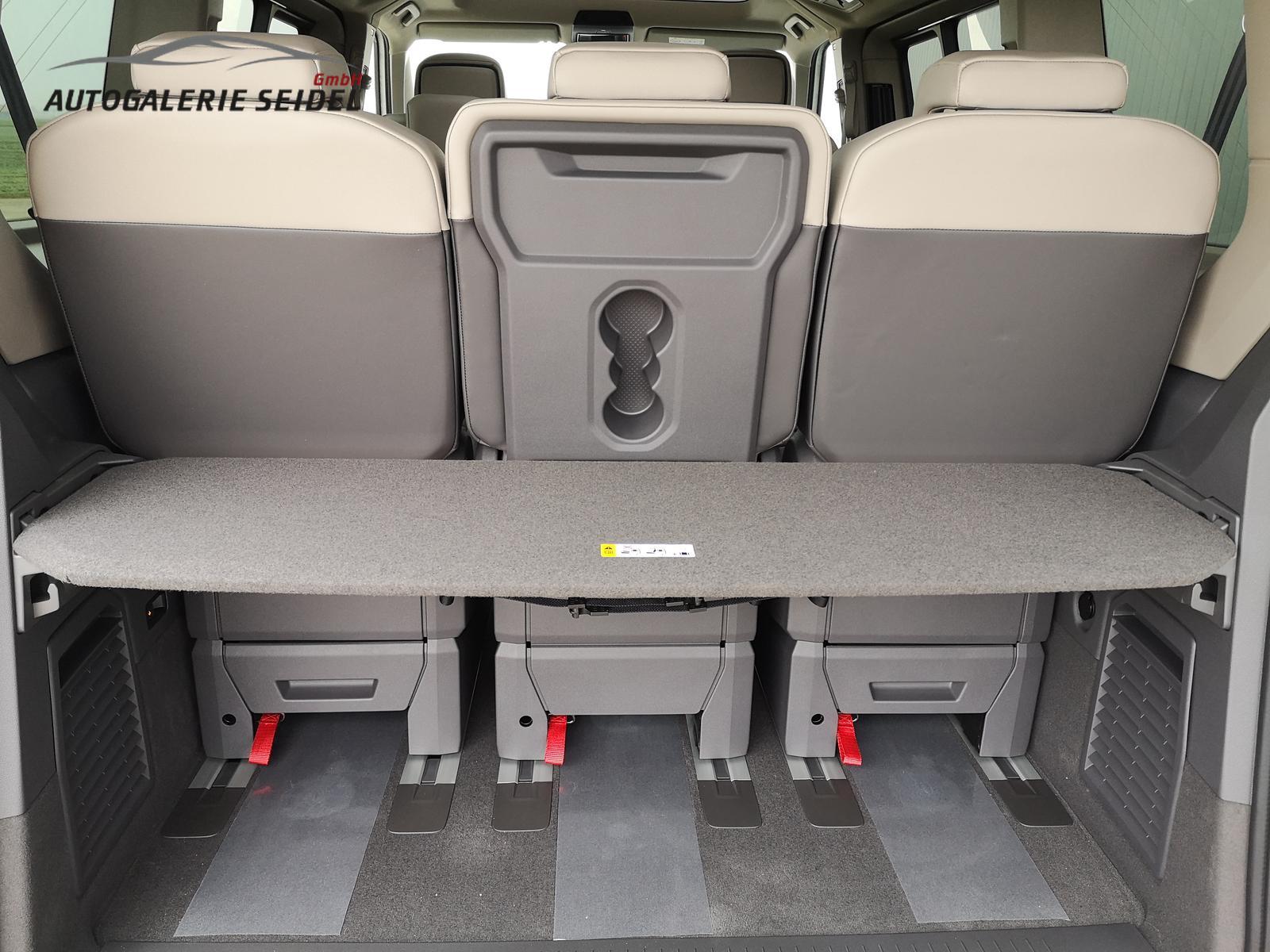 Fahrzeug 8-fach-bereift, Leichtmetallräder 7,5J x 18 (Sport Edition Design TN28, schwarz glanzgedreht) mit Sommerreifen 235 50 R18, Leichtmetallräder 7,5 J x 18 ""Toshima"" schwarz mit Winterreifen (M+S Kennung inkl. Schneeflocke / Allwetterreifen), (0NP) Bulliplakette am Kotflügel, (1U3) Bodenschienen mit Multifunktionstisch inkl. 3 Becherhalter, verschiebbar auf der vollständigen Länge des Schienensystems, (2FT) Multifunktionslederlenkrad beheizbar mit Schaltwippen, (4A3) Sitzheizung vorne, (4GX) Frontscheibe beheizbar und geräuschdämmend, (4K5) Zentralverriegelung Keyless Advance (schlüsselloses Öffnen und Starten),(6I6) Travelassistent, (6KF) Scheinwerferleiste hinterleuchtet, (7AL) Diebstahlwarnanlage, (7UY) Radio Navigationssystem Discover Pro, (9AH) Klimaanlage ""Air Care Climatronic"", (N2S) Sitzbezug Bi-Colour ""ArtVelours"", (Z2Q) Anhängerrangierassistent ""Trailer Assistent"" inkl. Anhängerkupplung schwenkbar, Parklenkassistent inkl. Rückfahrkamera, (Z8A) Schiebefenster im Fahrgastraum links und rechts, Fenster ab B-Säule abgedunkelt, (ZBR) 7 Sitzer: Sitzvariante 2-2-3 (Vis-a-Vis entgegen der Fahrrichtung) inkl. 4 Armlehnen.