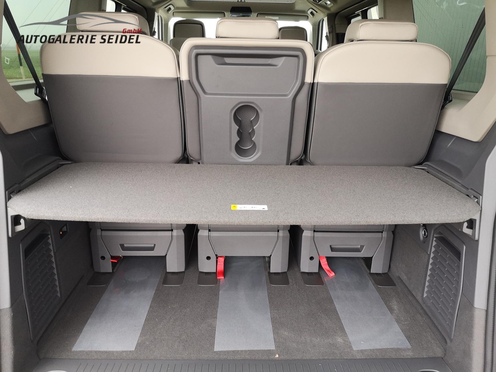 Fahrzeug 8-fach-bereift, Leichtmetallräder 7,5J x 18 (Sport Edition Design TN28, schwarz glanzgedreht) mit Sommerreifen 235 50 R18, Leichtmetallräder 7,5 J x 18 ""Toshima"" schwarz mit Winterreifen (M+S Kennung inkl. Schneeflocke / Allwetterreifen), (0NP) Bulliplakette am Kotflügel, (1U3) Bodenschienen mit Multifunktionstisch inkl. 3 Becherhalter, verschiebbar auf der vollständigen Länge des Schienensystems, (2FT) Multifunktionslederlenkrad beheizbar mit Schaltwippen, (4A3) Sitzheizung vorne, (4GX) Frontscheibe beheizbar und geräuschdämmend, (4K5) Zentralverriegelung Keyless Advance (schlüsselloses Öffnen und Starten),(6I6) Travelassistent, (6KF) Scheinwerferleiste hinterleuchtet, (7AL) Diebstahlwarnanlage, (7J2) Digital Cockpit Pro, (7UY) Radio Navigationssystem Discover Pro, (9AH) Klimaanlage ""Air Care Climatronic"", (N0K) Sitzbezug Bi-Colour Leder ""Savona"", (1D2) Anhängerkupplung schwenkbar, (Z8A) Schiebefenster im Fahrgastraum links und rechts, Fenster ab B-Säule abgedunkelt, (ZBR) 7 Sitzer: Sitzvariante 2-2-3 (Vis-a-Vis entgegen der Fahrrichtung) inkl. 4 Armlehnen, (1LB) Fahrwerk 17 Zoll, (2H5) Fahrprofilauswahl, (3FG) Panoramaglasdach, (7VL) Warmwasserstandheizung im Fahrerhaus inkl. FFB, (7W7) Proaktives Insassenschutzsystem, (9IJ) Mobiltelefon-Schnittstelle ""Comfort"" inkl. induktive Ladestation, (9VV) Soundsystem ""Harman Kardon"" inkl. 13 Lautsprecher, 840 Watt Gesamtleistung und Subwoofer, (KS1) Head Up Display, (P2G) Parkpaket Advance, Parklenkassistent inkl. ""Area View"" inkl. Rückfahrkamera, (ZED) Easy Open Paket Advanced, Umfeldbeleuchtung an der Heckklappe, Ambientebeleuchtung 30-farbig, Heckklappe sowie Schiebetüren elektrisch inkl. Easy Open/Close Funktion.